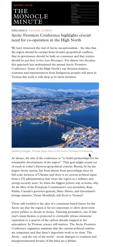The annual Arctic Frontiers conference kicks off in Tromsø today, and I have put some thoughts down in the Monocle Minute newsletter on why this kind of “talking shop” still matters – and perhaps is more important now than in quieter times.